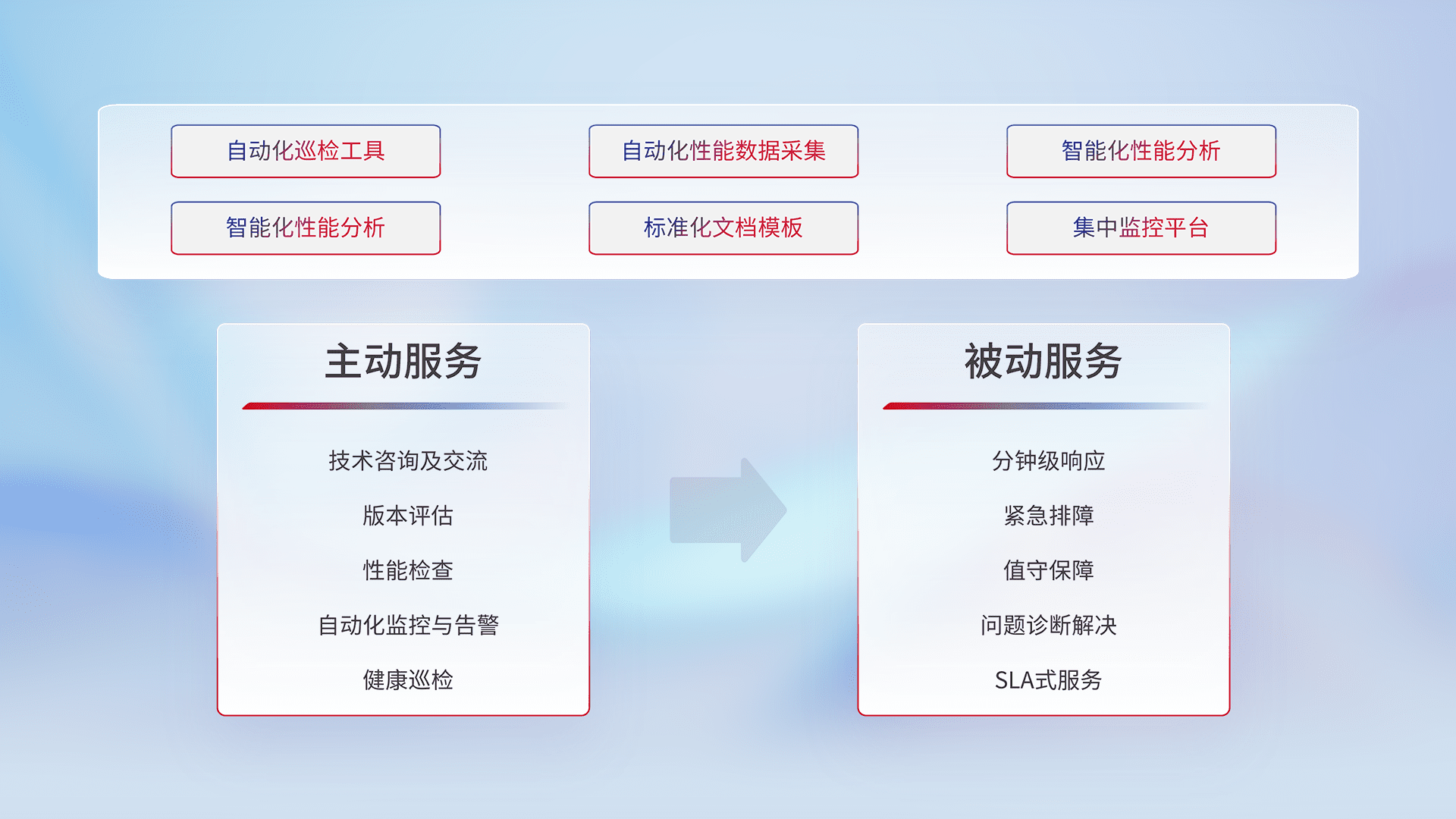 智能化工具和标准化文档,,,保障服务质量,,提供主动服务(包含技术咨询、、、、版本评估、、、性能检查、、自动化监控与告警、、健康巡检)和被动服务包含(分钟级响应、、、紧急排障、、、、值守保障、、、问题诊断解决、、、、SLA服务)。。